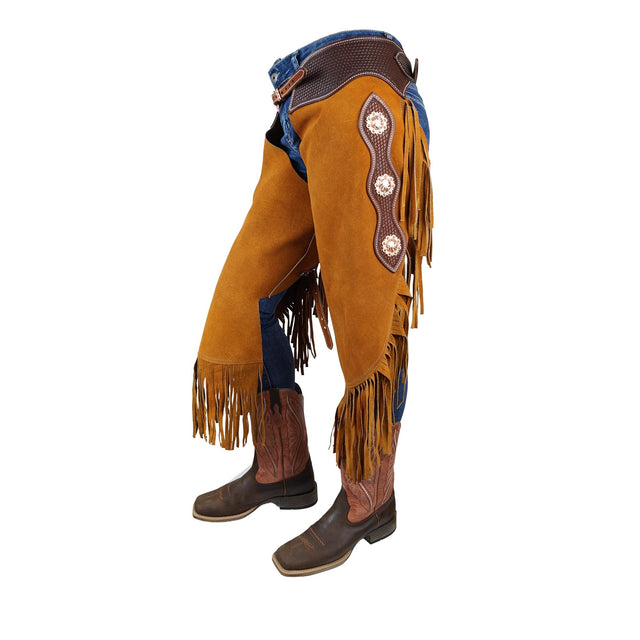 Hochwertige Chink Chaps aus Wildleder in Cognac-Braun. Der dunkelbraune Besatz mit Punzierung hebt sich farblich sehr schön ab. Die Chaps lassen sich sowohl vorne als auch hinten durch Schnallen verstellen.