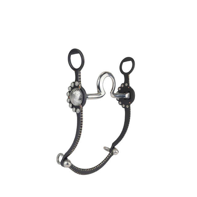Wunderschönes High Port Bit im Old California Style aus Black Steel mit schönen Silberverzierungen und kleinen Kupferakzenten. Aufgrund der angebrachten Distanzstange sind die Shanks fest fixiert, d.h. es handelt sich um eine Kandarre.