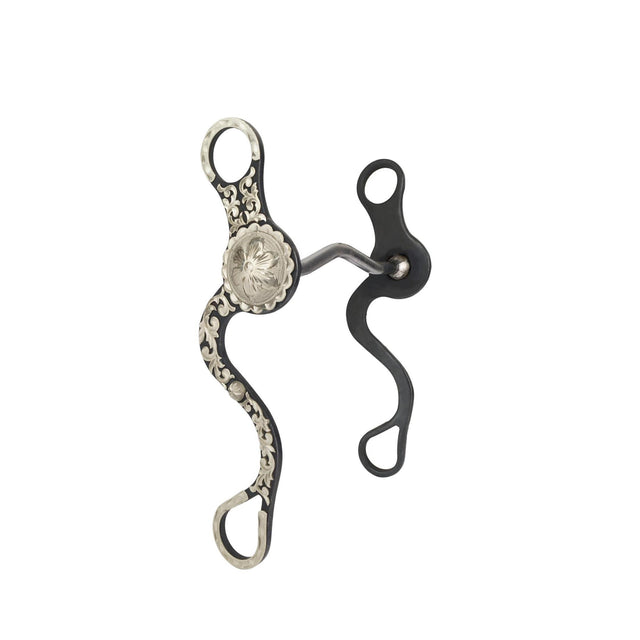 Wunderschönes Low Port Bit mit beweglichen Shanks aus Black Steel und aufwändiger Silberverzierung in Floral-Optik. Die Shanks sind lang und S-förmig geschwungen. Ein Show Bit der besonderen Art.