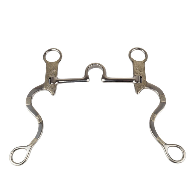 High Port Bit aus poliertem Edelstahl mit beweglichen Shanks. Die langen, S-förmigen Shanks sind mit Silberbeschlägen verziert. Ein schönes, schlichtes Show Bit zu einem hervorragenden Preis.