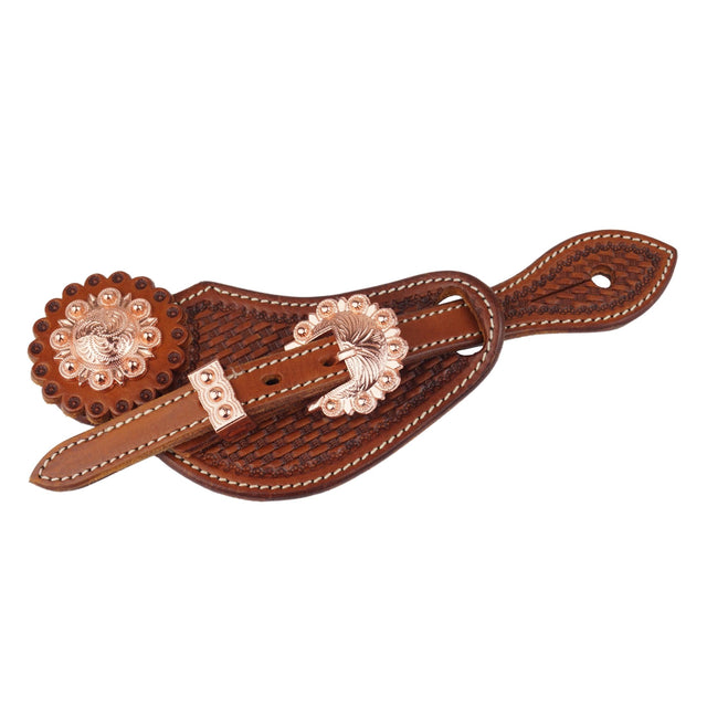 Schöne, auffällige Western Sporenriemen mit Basket Punzierung und roséfarbenen Schnallen und Conchos.