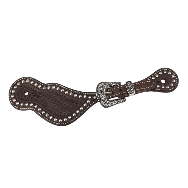 Gut verarbeitete Western Sporenriemen aus dunklem Rindsleder mit Basket-Punzierung und silbernen Dots. Die schwarz-silbernen Schnallen in Floral Optik passen hervorragend zum dunklen Leder und lassen sich bei Bedarf problemlos austauschen. Sie sind verschraubt.