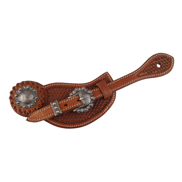 Schöne, auffällige  Western Sporenriemen mit Basket Punzierung und stahlfarbenen Schnallen und Conchos. Ideal als Showsporenriemen geeignet.