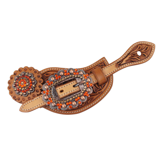 Schöne, auffällige Western Sporenriemen für Damen mit Flower-Punzierung und großen Strass-Schnallen und -Conchos. Die braun-orangenen Schnallen und Conchos sind verschraubt und können jederzeit ausgetauscht werden. So können die Sporenriemen problemlos an ein anderes Showoutfit angepasst werden.