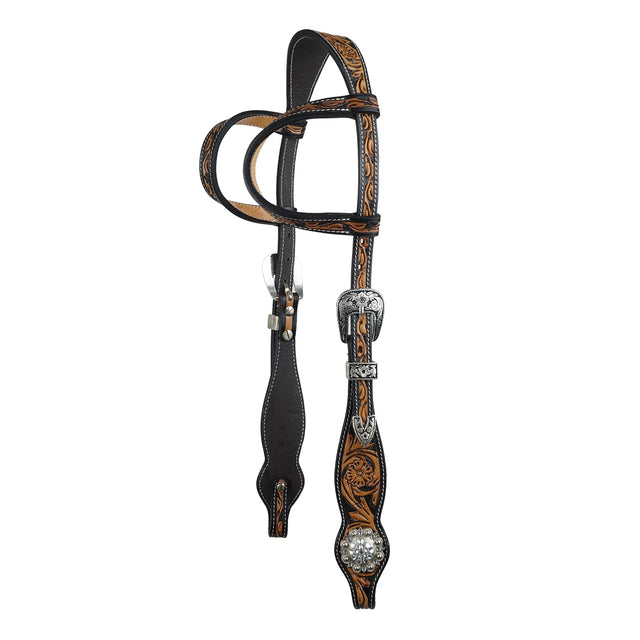 Schöne Westerntrense mit Flower Punzierung in zweifarbiger Optik (Mittelbraun und Schwarz). Die silber-schwarzen Schnallen in Floral-Optik und Zierconchos mit Strass machen die Trense zu einem wahren Schmuckstück.