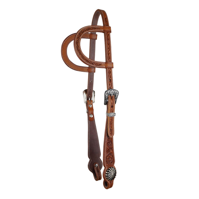 Schöne Zweiohr Westerntrense mit Flower Punzierung und schwarz-silbernen Schnallen in Floral-Optik. Die Backenstücke sind etwas breiter geschnitten und mit farblich passenden Sunburst Conchos geschmückt.