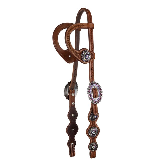 Auffällige Show-Westerntrense mit Basket Punzierung und lilanen Strass-Schnallen und -Conchos. Ein echter Hingucker für jedes Turnier.
