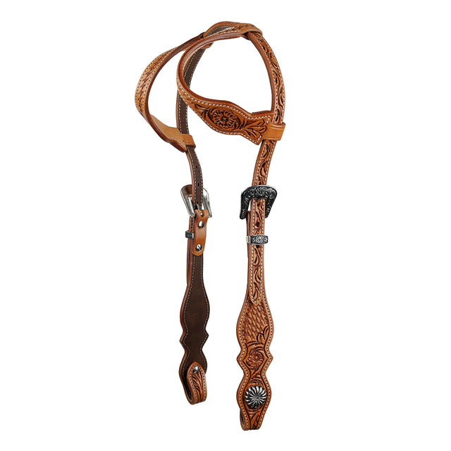 Schöne Westerntrense mit Flower-Basket Punzierung. Die Backenstücke sind etwas breiter geschnitten und mit einem Zierconcho versehen. Der Verschluss für das Gebiss ist verschraubt. Die Zweiohrtrense ist aus qualitätsvollem, argentinischem Rindsleder gefertigt und hochwertig verarbeitet. Die Innenseite des Kopfstücks ist mit weichem Nubuk-Leder verkleidet.