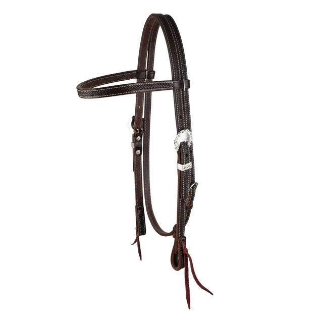Schlichte dunkelbraune Westerntrense mit ausgefallener Arrow Punzierung, geradem Stirnriemen und silbernen Schnallen. Die Schnallen lassen sich dank der angebrachten Chicago-Schrauben bei Bedarf problemlos austauschen.