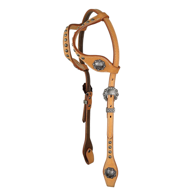 Schöne Zweiohr Westerntrense mit Ziernieten. Die Backenstücke sind unten breiter geschnitten und mit einem Zierconcho versehen. Der Verschluss für das Gebiss ist verschraubt. Die Zweiohrtrense ist aus qualitätsvollem, argentinischem Rindsleder gefertigt und hochwertig verarbeitet. Die Innenseite des Kopfstücks ist mit weichem Nubuk-Leder verkleidet.